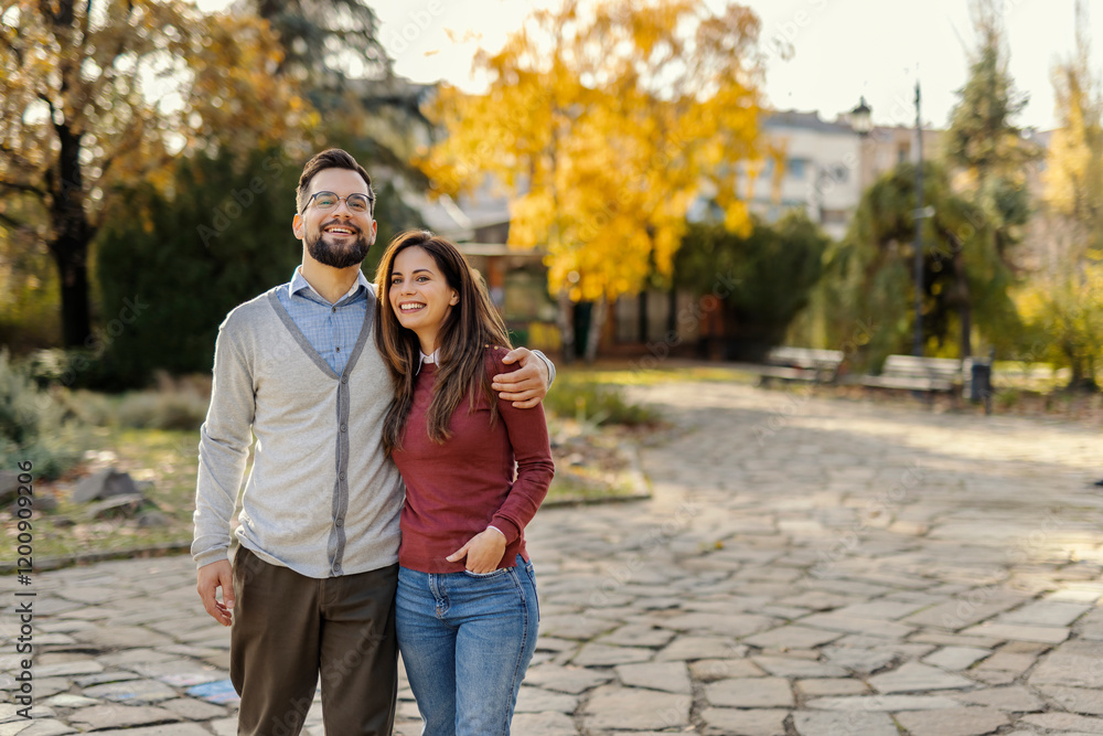 Portrait of young happy couple hugging and looking at camera in city park.