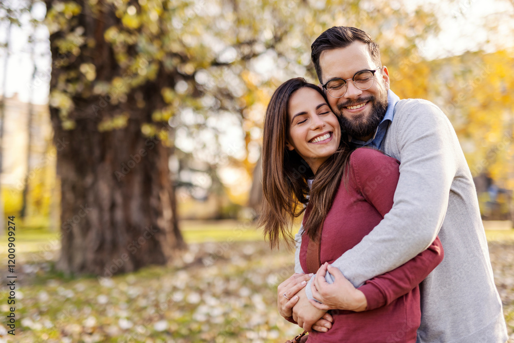 Young sweet couple hugging with eyes closed and spending time together in city park.