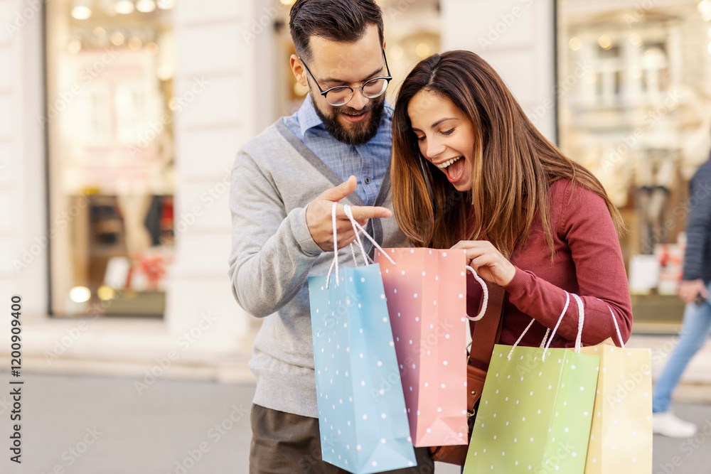 Portrait of fashionable shopaholic couple looking at shopping bags on city street.