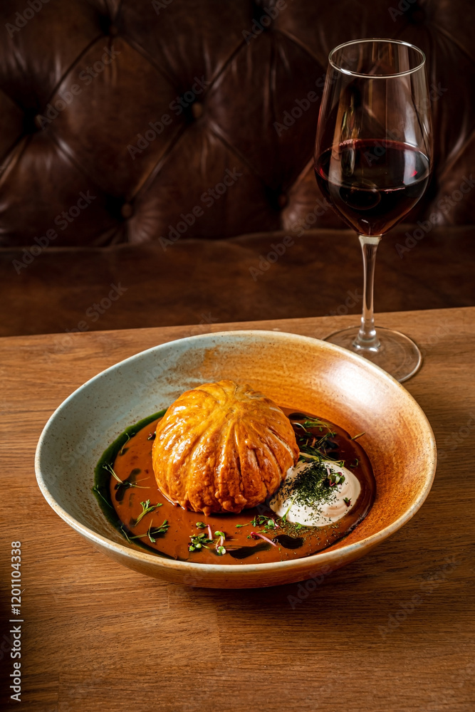 meat pie with sauce on wooden table