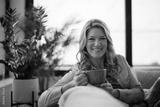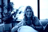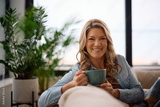 Happy woman enjoying in cup of coffee at home and looking at camera.