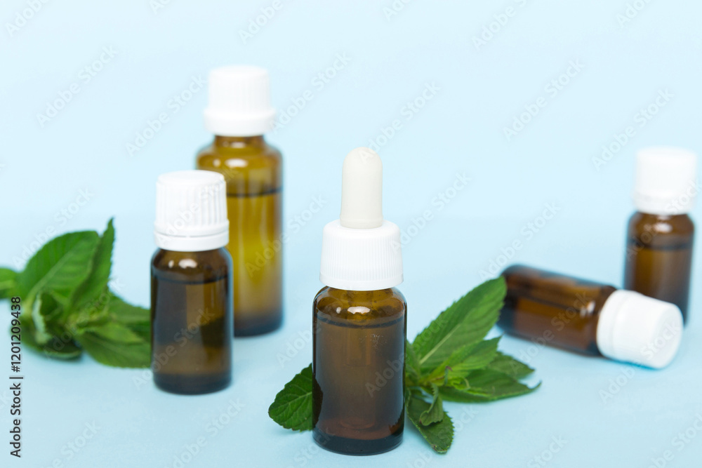 Natural Mint Essential Oil in a Glass Bottle. organic cosmetics with herbal extracts of mint on colored background