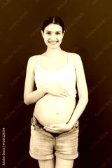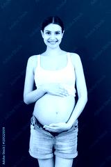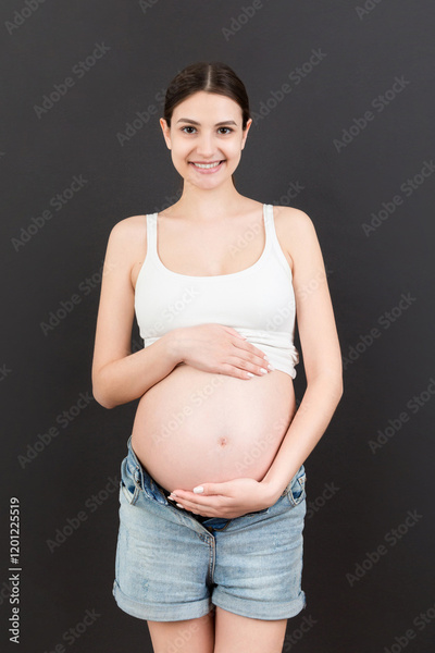 naked pregnant woman's belly wearing opened jeans at colorful background with copy space. Pregnancy concept