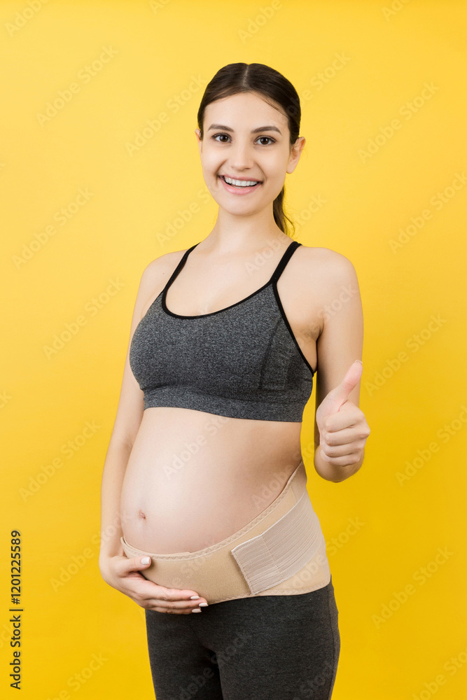 Portrait of pregnant woman wearing maternity belt on her belly and showing thumb up gesture at yellow background. Orthopedic abdominal support belt concept. Copy space