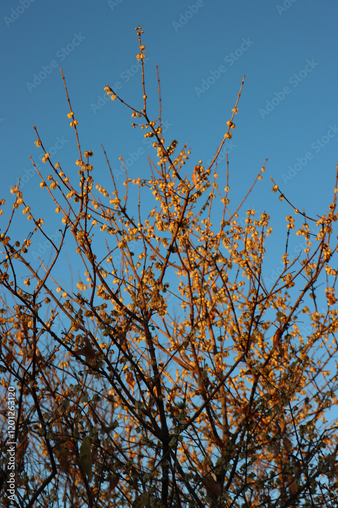 Flowering Chimonanthus praecox or Calycanthus branches against blue sky. Yellow flowers of Wintersweet bush on winter