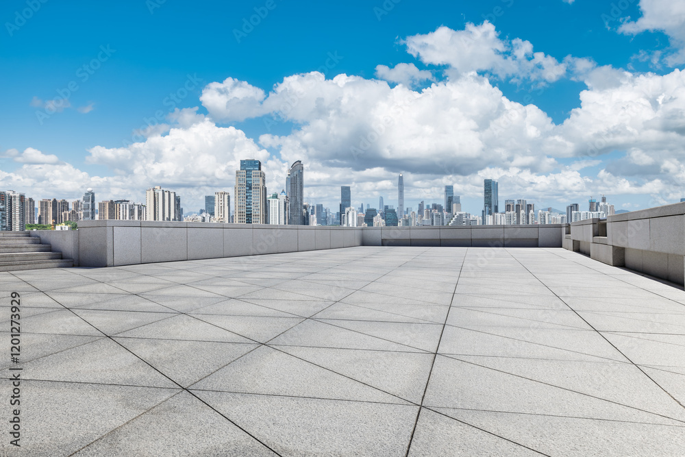 Empty rooftop terrace with view of city skyline and cloudy sky