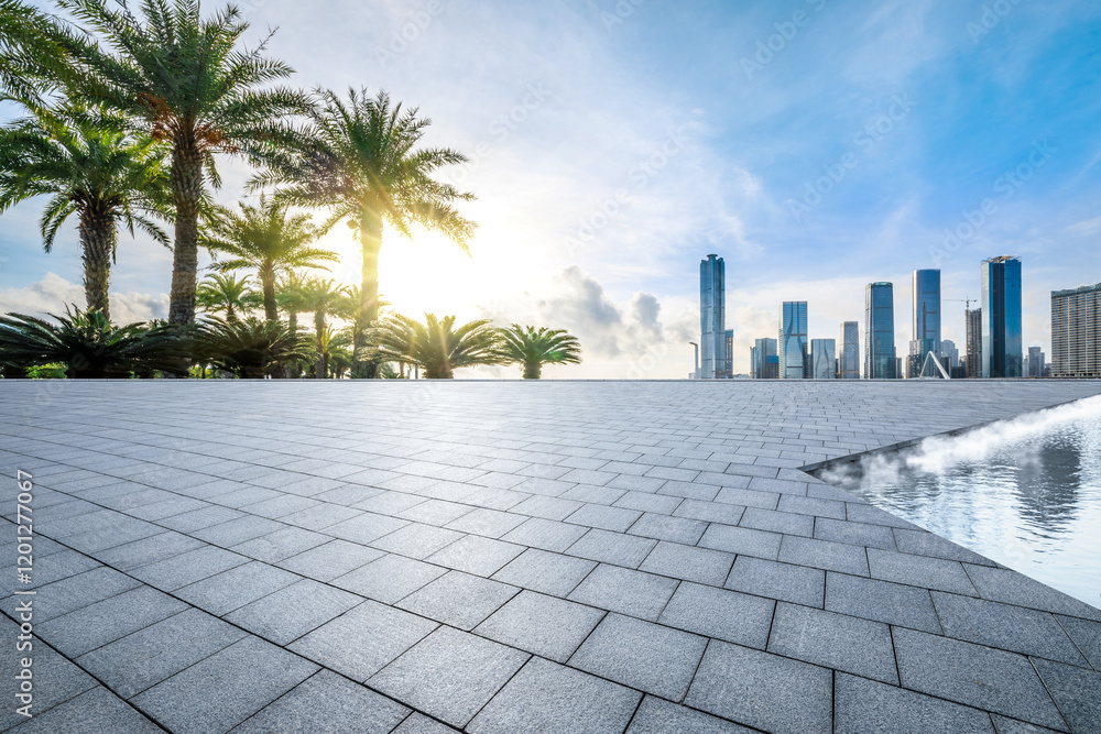 Empty pavement with palm trees and city view during bright sun