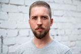 Serious man with a beard and mustache looking at the camera, white brick wall background