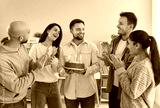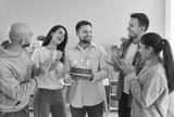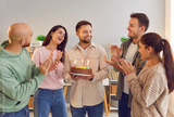 A group of friends gives a man a cake for his birthday and applauds, close-up. Young people congratulate you on your birthday. The man rejoices at the congratulations. Holiday, birthday greetings
