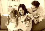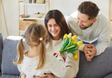 Loving father and young daughter present a bouquet of flowers to the happy mother at home, celebrating Women Day, Mother Day or a birthday with affection and love in a family setting.
