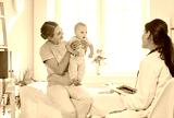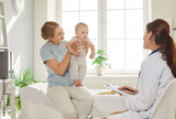 Happy mother and child seeing pediatrician at clinic. Smiling young woman holds cute little baby who's looking at doctor with surprised curious friendly face expression. Children, health care concept