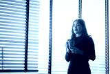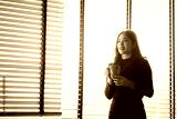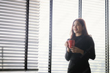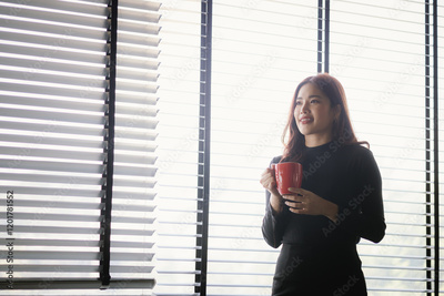 A confident young Chinese woman enjoys a peaceful coffee break in a modern cafe. Surrounded by city life, she relaxes with a book and portable device, balancing work, leisure, and indulgence.