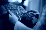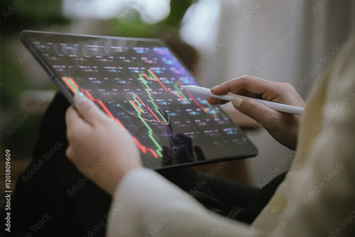 Close-up of hand analyzing financial data on digital tablet, showing stock market charts and cryptocurrency trends, investment planning and artificial intelligence in modern finance.