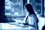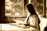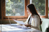 Cheerful Asian businesswoman working on laptop analyzing charts and reviewing documents. This image represents professionalism, organizational planning, finance and technology in a vibrant workplace.