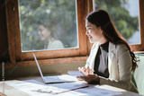 Cheerful Asian businesswoman working on laptop analyzing charts and reviewing documents. This image represents professionalism, organizational planning, finance and technology in a vibrant workplace.