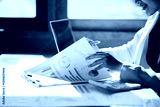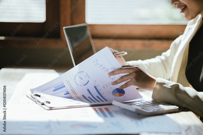 Cheerful Asian businesswoman working on laptop analyzing charts and reviewing documents. This image represents professionalism, organizational planning, finance and technology in a vibrant workplace.