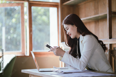 Cheerful Asian businesswoman working on laptop analyzing charts and reviewing documents. This image represents professionalism, organizational planning, finance and technology in a vibrant workplace.