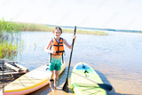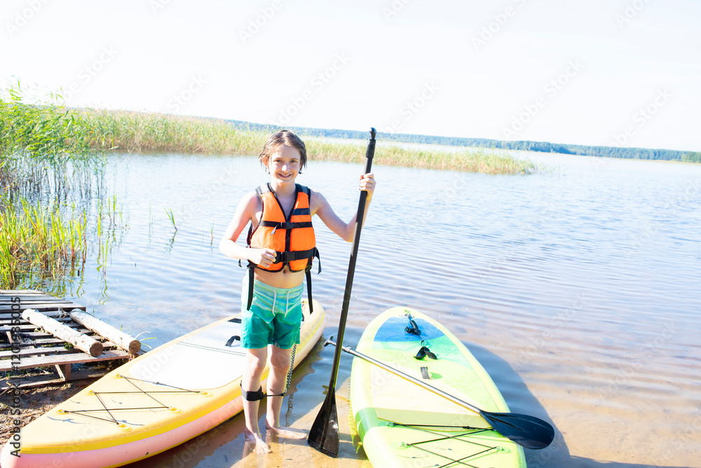 A boy in a life jacket and swimming shorts stands on the shore of a lake, near SUP boards, holding a paddle in his hands.
