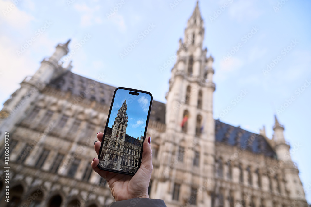Tourist taking photo of brussels town hall with smartphone. Belgium tourism