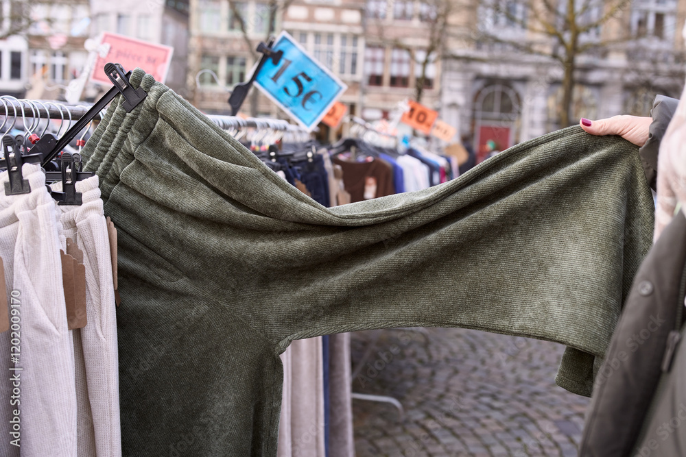 Woman choosing clothes at an outdoor flea market in belgium. Belgium tourism
