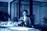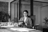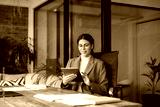 Young latin Hispanic professional business woman working on pad pc computer. Middle eastern businesswoman holding digital tablet using tab application sitting at desk workplace in office. Copy space