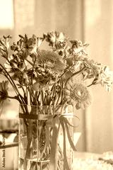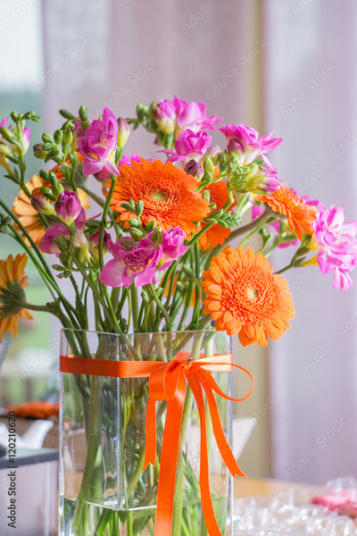 Wedding decorations with colorful flowers, napkins, tapes and ta