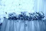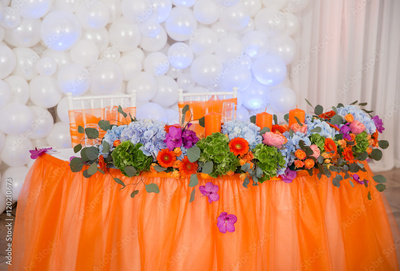 Wedding decorations with colorful flowers, napkins, tapes and ta