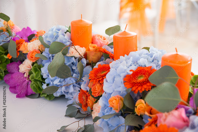 Wedding decorations with colorful flowers, napkins, tapes and ta