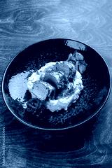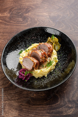 A gourmet dish featuring sliced roasted meat on a bed of creamy mashed potatoes, garnished with pickles, pickled onions, and fresh herbs, presented on a stylish black plate.