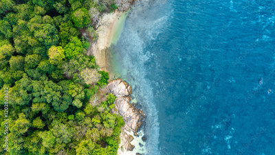 Nature of the beach and sea Summer with sunshine, sandy beaches, clear blue waters sparkling against the blue sky. On an island with good ecology and environment Background for summer vacation
