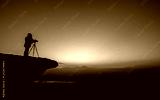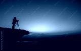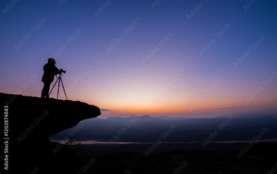 Silhouetted Photographer Traveller stands edge of rocky cliff setting up a camera on a tripod photographer becomes one with the environment in their pursuit of capturing this magical moment.