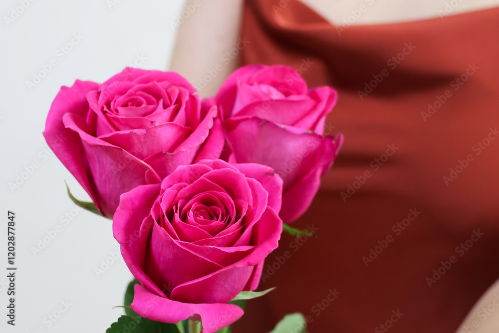 Composition with a bouquet of pink roses on a delicate fabric background. A holiday gift, pastel colors. Festive delicate background, birthday, wedding bouquet. Valentine's Day Greeting Card Design