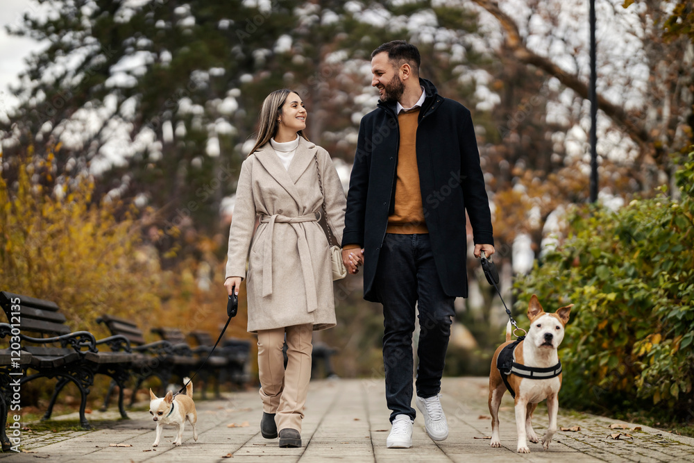 Young happy romantic couple holding hands and walking with their canine friends in city park.