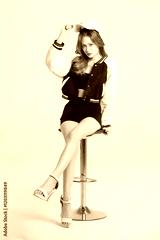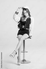 Fashion beauty portrait of asian beautiful sexy cheerful confident young woman with long orange hair, model wearing fashionable black outfit and a cap sitting on stool pose looking on white background