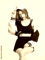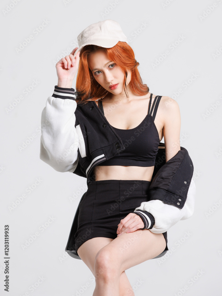 Fashion beauty portrait of asian beautiful sexy cheerful confident young woman with long orange hair, model wearing fashionable black outfit and a cap sitting on stool pose looking on white background