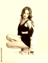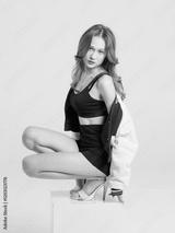 Full length fashion beauty portrait of asian beautiful sexy cheerful confident young woman with long orange hair, model wearing fashionable black outfit sitting on a cube posing on white background.