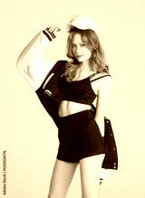 Fashion portrait of asian beautiful sexy cheerful confident young woman with long orange hair model wearing fashionable black outfit and cap standing pose looking camera on white background in studio.