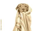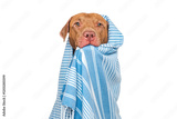 Cute dog and blue towel. Grooming dog. Close-up, indoors. Studio shot. Concept of care, education, obedience training and raising pets