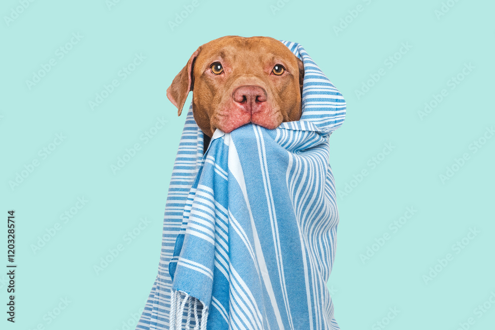 Cute dog and blue towel. Grooming dog. Close-up, indoors. Studio shot. Concept of care, education, obedience training and raising pets