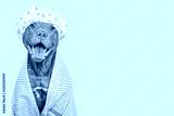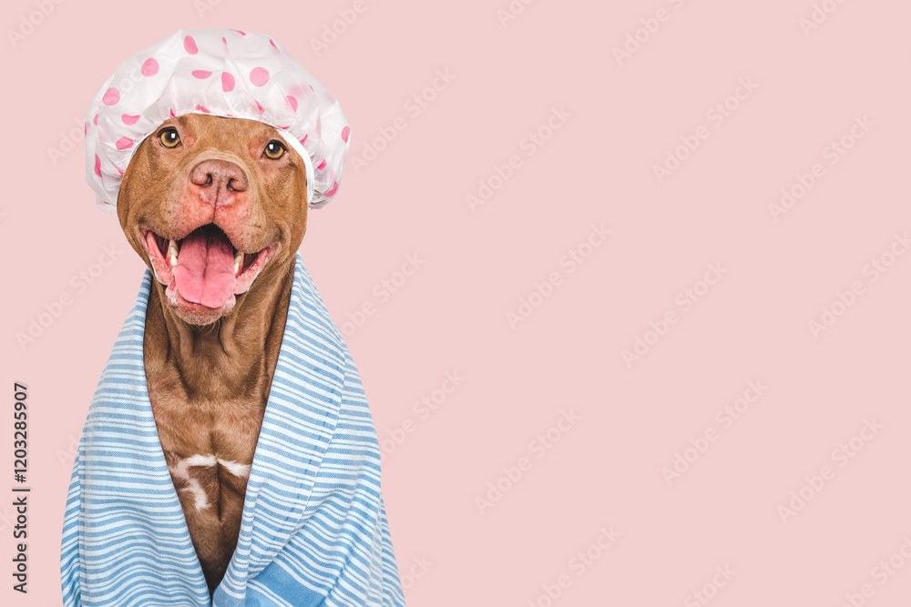 Cute dog, shower cap and blue towel. Grooming dog. Close-up, indoors. Studio shot. Concept of care, education, obedience training and raising pets