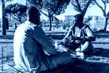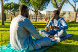 Two senegalese men drinking tea in park wearing traditional dashiki clothing