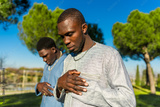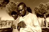 Senegalese men praying in traditional grand boubou during ramadan in park