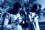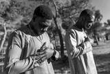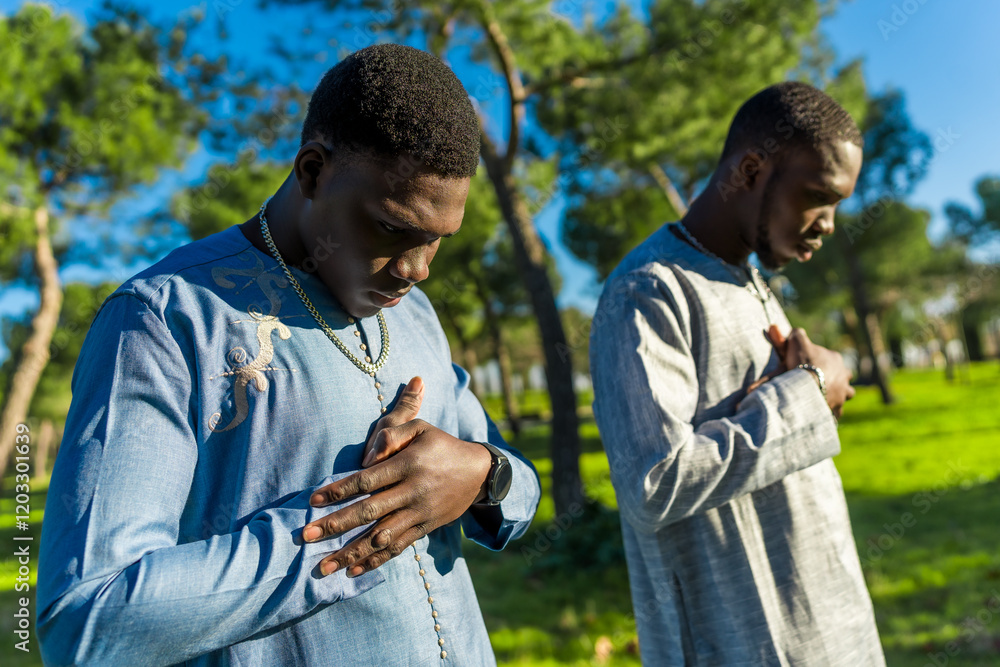 Two senegalese men praying outdoors in traditional dashiki clothing