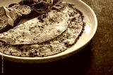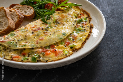 Omelette - scrambled eggs with red and green bell pepper on black table