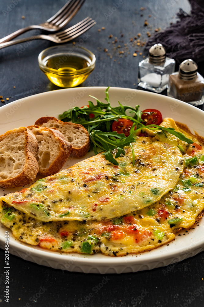 Omelette - scrambled eggs with red and green bell pepper on black table