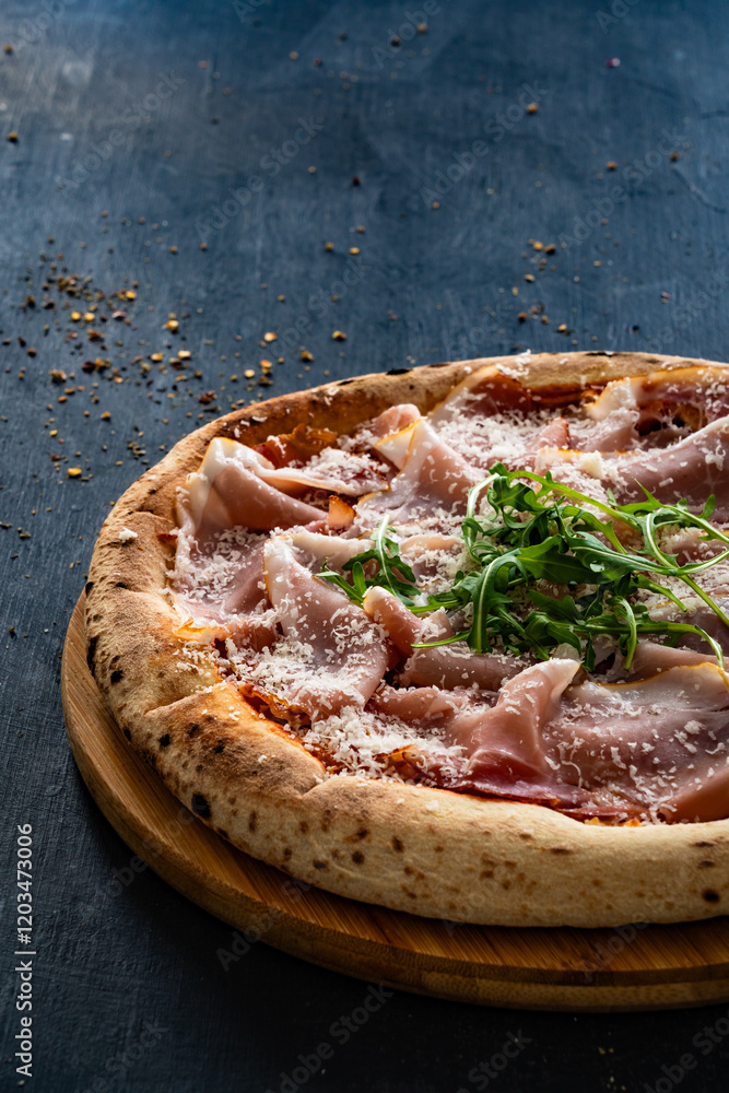 Pizza with cured ham, parmesan cheese and arugula on black table