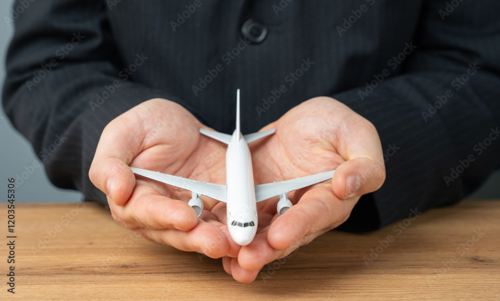 An airline plane in the palms of a businessman or official. Aircraft leasing and insurance by airlines. The importance of air travel. Investments in the air transport industry.
