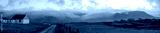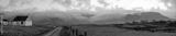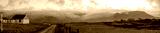 Panorama. View of mountains in the fog and a Assaranca waterfall. Donegal, Ardara.
