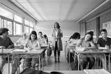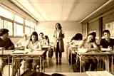 High school students are taking a test in a classroom while the teacher watches them and walks around the room. Image with copy space.