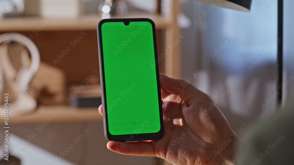 Smartphone user looking green screen at desk closeup. Manager holding cellphone